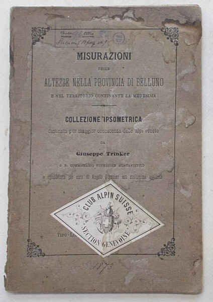 Misurazioni delle altezze nella Provincia di Belluno e nel territorio confinante con la medesima. Collezione ipsometrica destinata per maggior conoscenza delle Alpi Venete.