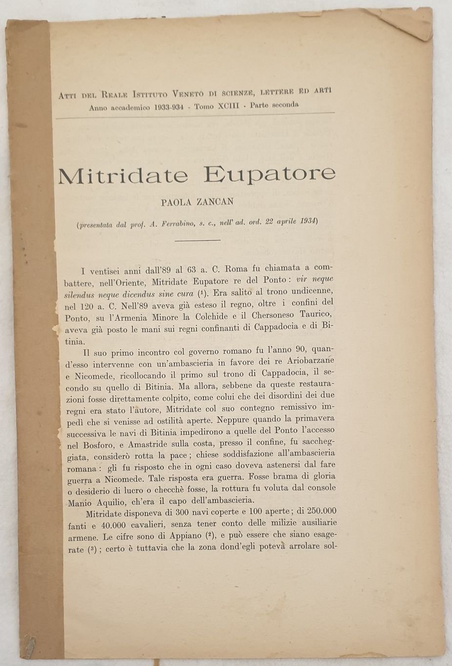 Estratto del 1934 su Mitridate Dioniso Re del Ponto di Paola Zancan. Relazione presentata dal prof. A. Ferrabino nell'ad. ord. del 22 aprile 1934. Licenziate le bozze per la stampa il giorno 13 luglio 1934. Estratto da "Atti del reale Istituto veneto di Scienze lettere ed arti" anno accademico 1933 34 Tomo XCIII parte seconda. In buone condizioni.Copertina assente. Legatura in buone condizioni. Pagine in buone condizioni con rare fioriture. Dorso coperto da carta. In 8. cm 25x16,5. Pp. da 1217 a 1232.Extract of 1934 about Mitridate Dioniso King of Ponto by Paola Zancan. Report presented by prof. A. Ferrabino in the ad. ord. of 22nd of april 1934. Published the 13th of july 1934. Extract from "Atti del reale Istituto veneto di Scienze lettere ed arti" year 1933 34 Tome XCIII second part. In good conditions. Cover lacks. Binding in good conditions. Pages in good conditions with occasional foxing. Spine covered by paper. In 8. cm 25x16,5. Pp. from 1217 to 1232.
