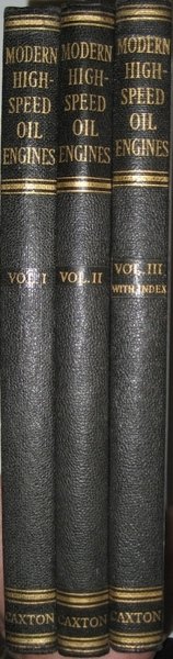 No marks or inscriptions. No creasing to covers or to spine. Three very clean very tight copies with bright unmarked boards, slightly dusty page edges and no bumping to corners. 237 + 218 + 230pp. Very detailed work on the high-speed oil engine, a key feature of modern life from cars to locomotives to boats. Well illustrated. A heavy set.