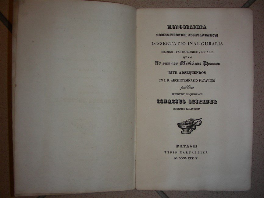 MONOGRAPHIA COMBUSTIONUM SPONTANEARUM. Dissertatio inauguralis medico-pathologico-legalis quam ad summos medicinae honores rite adsequendos in I. R. Archigymnasio Patavino pubblice submittit disquisitioni. Bohemus Kolinensis.