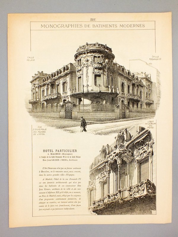 Extrait de 2 ff. in-folio (36,5x28 cm), Monographies de Bâtiments Modernes, E. Ducher éditeur, Paris, s.d. (circa 1905), 4 pp. (pp. 325 à 328) Etat très satisfaisant (petits accrocs sans mques sur bords, explaire très propres par ailleurs) pour cet extrait de la revue d'architecture "Monographies de Bâtiments Modernes", relatif à un petit palais dans le style Art Nouveau, conçu par l'architecte de la ville de Madrid, José Grases Riera (1850-1919) en 1902-1904, pour le compte du financier espagnol Javier Gonzalez Longoria. Depuis 1950, ce bâtiment est le siège de la SGAE (Sociedad General de Autores y Editores). Quant à l'architecte, il est notamment connu pour son monument en l'honeur du roi Alphonse XII au Parque del Retiro et pour divers bâtiments tels que le Palacio de la Equitativa, à Madrid.