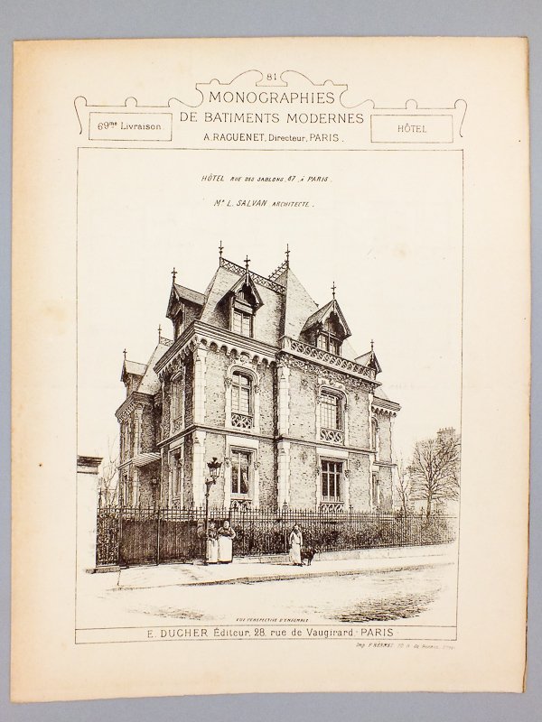 1 numéro in-folio (36,5x28 cm), 69me livraison, E. Ducher éditeur, Paris, s.d. (circa 1895), 8 pp. (pp. 81 à 88) Très bon état pour ce numéro de la revue d'architecture "Monographies de Bâtiments Modernes", relatif à un hôtel particulier construit vers 1895 au N° 87 de la rue des Sablons. L'architecte Léon Salvan est connu en particulier pour ses immeubles particuliers de la Villa Guibert, rue de La Pompe et pour d'autres hôtels particuliers du XVIe arrondissement. Ses constructions se caractérisaient pas un éclectisme complet, puisque cet architecte pouvait fort bien passer du style néo-Louis XV au style normand, en passant par l'Art Nouveau. Quant à l'hôtel particulier présenté ici, on peut a priori le rattacher au style néo-renaissance. Dans la même collection, pour cet architecte, cf. également l'hôtel particulider de la Rue Raynouard (.N° 5)