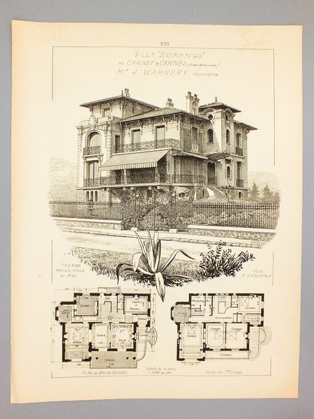 1 f. in-folio (36,5x28 cm), E. Ducher éditeur, Paris, s.d. (circa 1900), 2 pp. (pp. 295 et 296) Très bon état pour cet extrait de la revue d'architecture "Monographies de Bâtiments Modernes", relatif à une villa de la Côte d'Azur (Le Cannet), concue par l'architecte cannois James Warnery (1867-1921)