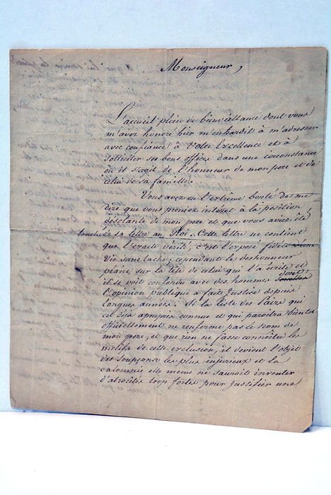 4 pages. (22x19 Cm). 2 feuillets. Deux émouvantes lettres du fils de Jean Lannes dans laquelle il supplie ses interlocuteurs, dont le roi, de veiller à ce que son père soit nommé à la chambre des pairs à titre posthume, afin de conserver l'honneur de sa mémoire. Fils du Maréchal d'Empire Jean Lannes, que Napoléon considérait comme "son meilleur ami", il fut nommé pair de France à l'âge de 14 ans, en considération des services rendus par son père. Plusieurs passages sont raturés et réécrits dans la marge. Petites déchirures au niveau des plis. Mouillures angulaires.