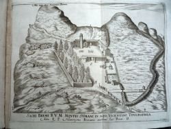 In-4° (cm. 19,8), legatura coeva in cartonato alla rustica con rinforzo al dorso (lievi segni d'usura al piatto post.); pp. [8], 200, [2] con 1 antiporta figurato n.t. (titolo in cornice architettonica con santi, angeli e putti), 1 illustrazione in rame a p. pagina n.t. (ritratto della Vergine), 1 tavola illustrativa in rame ripiegata f.t. (deliziosa veduta del monte); capilettera e testatine in xilografia. Gora per sei fascicoli sempre meno fastidiosa che tocca però il ritratto della Madonna; piccoli segni di tarlo a qualche margine. Seconda edizione della più importante storia dell'antichissimo Santuario vicentino, custodito in passato da eremiti e meta di suggestivi pellegrinaggi. Cfr. Michel-Michel IV, 49. Manca a Cicogna, Lozzi, Graesse e Vinciana. Esemplare più che discreto. (SE1)
