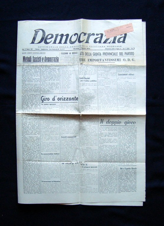 Periodico, Democrazia" Settimanale della Democrazia Cristiana Modenese Anno II - N. 29 Modena, 3 Agosto 1946 Modena, 1946, cm 50x35, pp. 4 (bifolio); peccetta indirizzo al margine sup. Numero completo. Condizioni di conservazione Esemplare in buone condizioni con leggere tracce d'uso e del tempo, pieghe di conservazione che si presentano leggermente ingiallite e con qualche piccolissimo strappetto. all'interno lungo articolo di mezza pagina "due anni dopo l'eccidio di Monteombraro" SC03.D14784 blu "