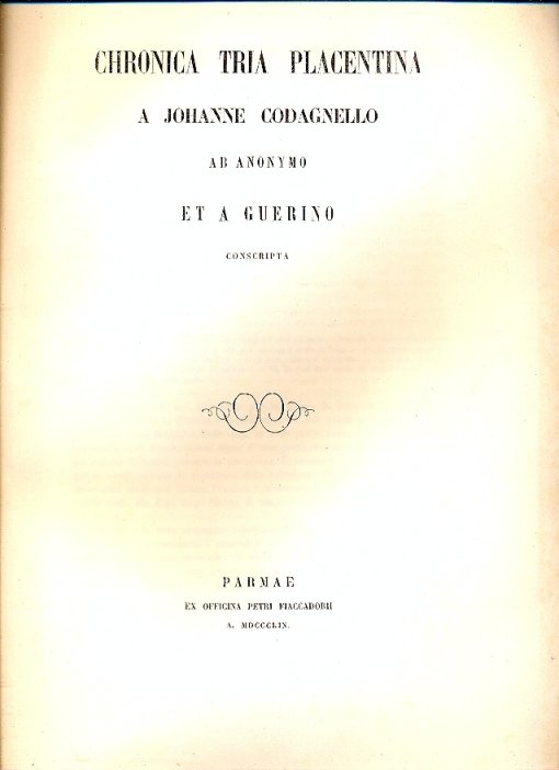 8 voll., in 4°, br. Disponiamo: - Statuta Communis Parmae digesta anno 1255, pp. XVI + LI + 495. - Statuta Communis Parmae ab anno 1266 ad . 1304, pp. XXXIV + 356. - Statuta Communis Parmae ad anno 1316 ad 1325, pp. XXVI +352. - Statuta Communis Parmae anni 1347, pp. XXII + 356. - Chronica Fr. Salimbene Parmensis Ordinis Minorum ex codice Bibliothecae Vaticanae, nunc primum edita, pp. XIV + 424. - Chronica Parmensia a sec. XI ad exitum sec. XIV. Accedunt varia quae spectant ad historiam patriae civilem et ecclesiasticam, pp. XXXV + 563. - Chronica Tria Placentina a Johanne Codagnello ad anonymo et a Guerino conscripta, pp. XXXIV + 441. - Statuta varia Civitatis Placentiae, pp. 592. Bei margini, barbe. Mende alle copp. , alcune ant. mancanti. I volumi si presentano sciolti, collazionati. Opera introvabile.