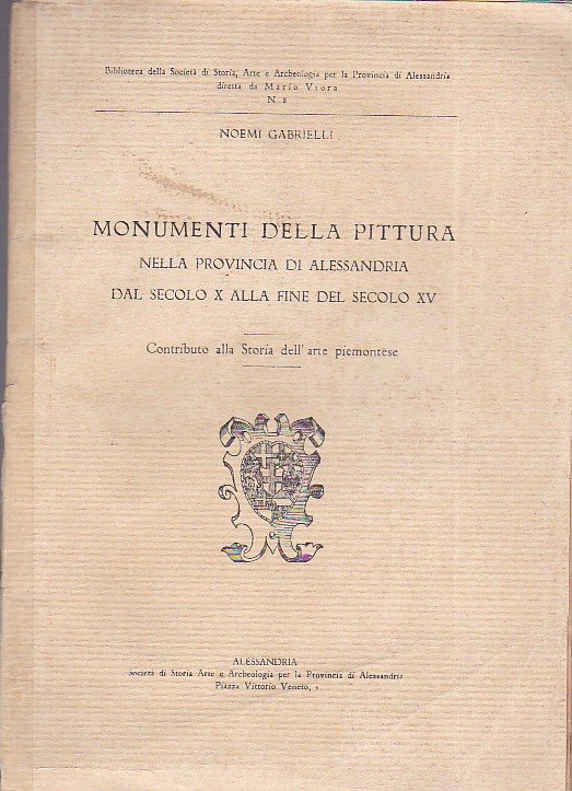 In-8°, pp. 49, (1), brossura editoriale a stampa. 20 tavv. in b.n. f.t. Ottimo stato. Intonso. Volume ottavo della 'Biblioteca della Societa di storia arte earcheologia per le provincie di Alessandria'. Cenni sull'antica pittura ad Alessandria e nella sua provincia, sulle decorazioni del palazzo del conte Giovanni Zoppi a Cassine, sugli affreschi della Cappella dell'Annunziata a Grondona, sulla scuola di Tortona.