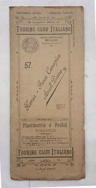 Tavola di 14 facciate di cm. 21,5 x 8 (perciò lunga cm. 112 circa). VG. ** Verificato sul terreno nel maggio 1901. Le "Planimetrie e profili ciclistici" del Touring Club Ciclistico Italiano sono una collezione di pubblicazioni che ha qualcosa, anzi è più esatto dire molto! di epico: i 57 itinerari, pubblicati in 51 fascicoli tra il 1896 e il 1901, Luigi Vittorio Bertarelli, il fondatore del T.C.I., se li è fatti tutti in bicicletta, appuntando ogni informazione utile su un taccuino. Ogni itinerario è descritto su una lunga tavola, che si svolge orizzontalmente e che è ripiegata in una copertina con titoli, fregi e piccolo stemma del T.C.C.I. La tavola presenta un profilo altimetrico a tre colori e la cartina dell'area, con il tracciato evidenziato in rosso. Il profilo, oltre alle quote, contiene l'indicazione delle distante, della qualità delle strade (polverose, discrete, buone.), delle tappe e altre notizie utili (sorgenti, "splendido panorama", hotel, ristoranti, servizi postali.).