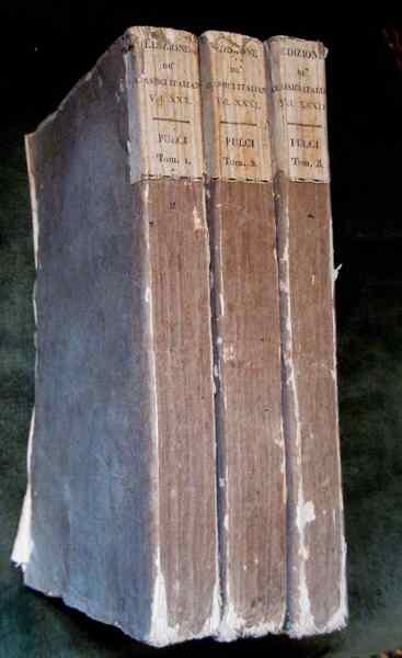 Tre volumi in 8°; pp. xii, 339 (1); 334 (2); 304 (2). Antiporta con ritratto dell’autore incisa in ramenel primo volume. Brossura muta azzurrina originale. Titoli su etichette a stampa. Dorsi con mancanze, per il resto buona copia, a pieni margini. Ristampa dell'edizione del 1732, giudicata la più corretta. Cfr. Gamba, 793.