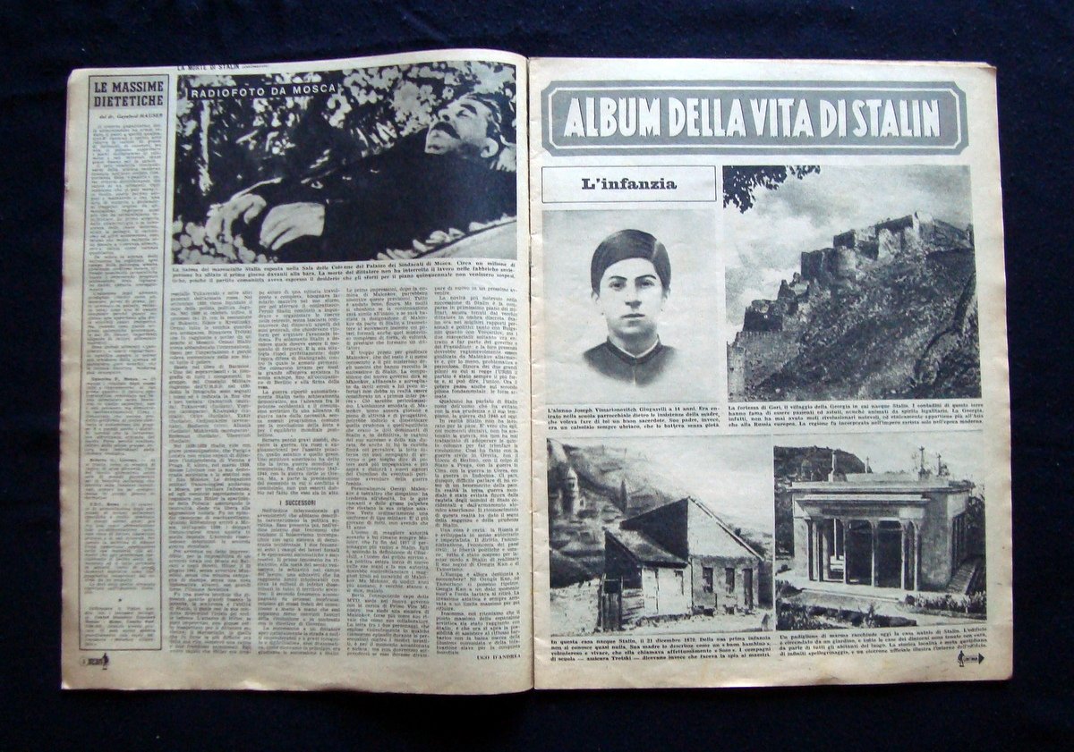 Periodico illustrato, La settimana Incom" Anno VI - 14 Marzo 1953 N. 11 Giuseppe Stalin è morto nel Cremlino. Roma, 1953; cm 35,5x27,5, pp.46, con ill.fot. b/n e alcune a colori + ins. pubblic.in b/n. Numero completo. Condizioni di conservazione Esemplare in buone condizioni con leggere tracce d'uso e del tempo; dorso e margini con leggre abrasioni e minuscoli strappetti. Numero completo. all'interno "Album della Vita di Stalin" 7 pagine dedicate SC03.D14772F blu "
