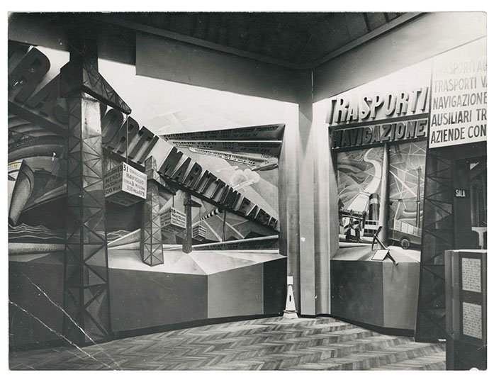 “Mostra della Rivoluzione Fascista una parete della Sala delle Realizzazioni Trasporti [didascalia verso]”