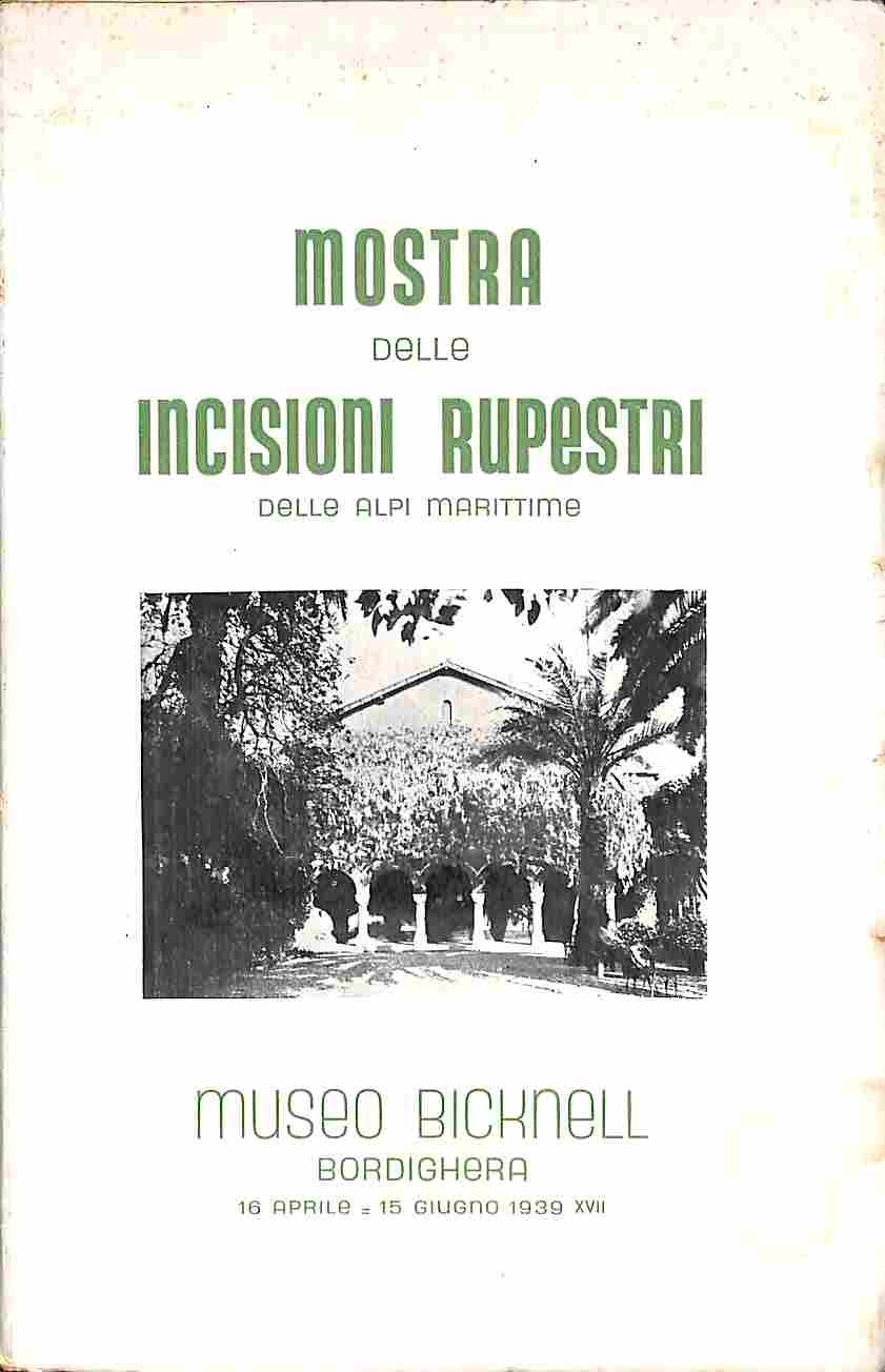 In 8 (cm 14 x 21,5), pp. 29 + 6 tavole con riproduzioni fotografiche in bianco/nero. Alone al piatto anteriore. Brossura editoriale. Raro catalogo di questa mostra avvenuta tra 16 aprile e 15 giugno 1939 al Museo Bicknell di Bordighera che raccoglieva calchi e disegni di incisioni rupestri delle Alpi Marittime, Monte Bego, Val Meraviglie, Cozie, Val Camonica, Libia, Spagna, Algeria, Nubia, Transgiordania, Scandinavia, Russia, Sud-Africa. Clarence Bicknell, inglese, nel 1878, si trasferi' da Londra a Bordighera per assolvere la funzione di pastore anglicano della colonia inglese che trascorreva li' i mesi invernali. Tra i piu' autorevoli e colti rappresentanti della comunita' inglese in Riviera fu animato da svariati interessi culturali dedicandosi soprattutto allo studio e alla scoperta della natura e della Liguria occidentale e delle valli dell'entroterra. Si dedico' allo studio della botanica, classifico' la flora ligure ed, essendo un abile acquarellista, la disegno'. Pubblico' infatti un volume con 132 tavole illustrate sulle piante della Riviera. Durante le sue escursioni sul Monte Bego, comincio' ad interessarsi e ad appassionarsi alle incisioni rupestri. Mori' nel 1918. Come si legge nell'introduzione di Piero Barocelli: "Delle incisioni rupestri e delle meraviglie di Monte Bego molti avevano parlato, ma pochi con sufficiente competenza.". Barocelli, Soprintendente alle Antichita' del Piemonte e della Liguria, lavoro' insieme a Bicknell e si occupo' di costruire un ricovero alpino in Val Meraviglie per rendere possibili agli studiosi i lavori di ricerca. Successivamente Carlo Conti prosegui' i lavori di studio arrivando a rilevare a fare calchi di circa 36.000 figure rupestri. La mostra presso il Museo Bicknell e' il risultato della vastita' e della complessita' del lavoro di Conti che rappresenta il completamento e il perfezionamento delle ricerche di Bicknell e che si concretizzo' in un intero corpus di gessi delle incisioni.