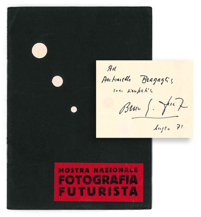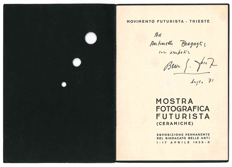 LIBROEdizione originale.CON AUTOGRAFO.Straordinario esemplare pregiato dalla dedica autografa del curatore, Bruno G. Sanzin, «Ad Antonella Bragaglia», ovvero la curatrice della memoria storica del «fotodinamismo» di A.G. Bragaglia nel secondo Novecento. La dedica è datata «luglio 1971»: la dottoressa Bragaglia aveva curato l’anno precedente l’edizione critica moderna proprio del «Fotodinamismo», pubblicata per i tipi dell’«Einaudi Letteratura». In ottime condizioni di conservazione.Bellissimo catalogo della mostra organizzata da Bruno G. Sanzin nella prima metà dell’aprile 1932 all'Esposizione permanente del Sindacato delle Belle Arti. Celebre la copertina con tre fori circolari a dimensione scalare, praticati lungo la diagonale del piatto anteriore. Introduzione del curatore segue il «Manifesto della fotografia futurista» (Marinetti e Tato) stampato su doppia pagina nello stesso stile grafico in cui — contemporaneamente, si presume — viene diffuso anche in velina leggerissima sciolta. Partecipano: Bertieri, Boccardi, Arturo Bragaglia, Demaninis, Farfa, Gramaglia, Fosco Maraini, Parisio, Pirrone, Pocarini, Tato, Wanda Wuz. Importante sezione di «ceramiche futuriste», con lavori di Mario Anselmo, Tullio D’Albisola, Farfa e Alf Gaudenzi, tutti prodotti dalla fornace di Mazzotti. Dieci riproduzioni di opere: Tato (Ritratto dinamico di F.T. Marinetti; Pastore e somarello), Parisio (Anno X a Napoli), Demaninis (Sintesi area di Trieste; Ritratto di B.G. Sanzin), A. Bragaglia (Fumatore), Guarneri (Madonna con bambino), Boccardi (Pane quotidiano), D’Albisola (Ritratto di bimba quindicenne). Oltre alle illustrazioni, alcune belle pagine di réclame disegnate tra gli altri da Marcello Claris.Nuovi archivi del futurismo, I, 1932/7; Scudiero - Rebeschini, Il futurismo veneto, p. 28; Lista, Futurismo e fotografia, p. 283; Salaris, Storia del futurismo, p. 213