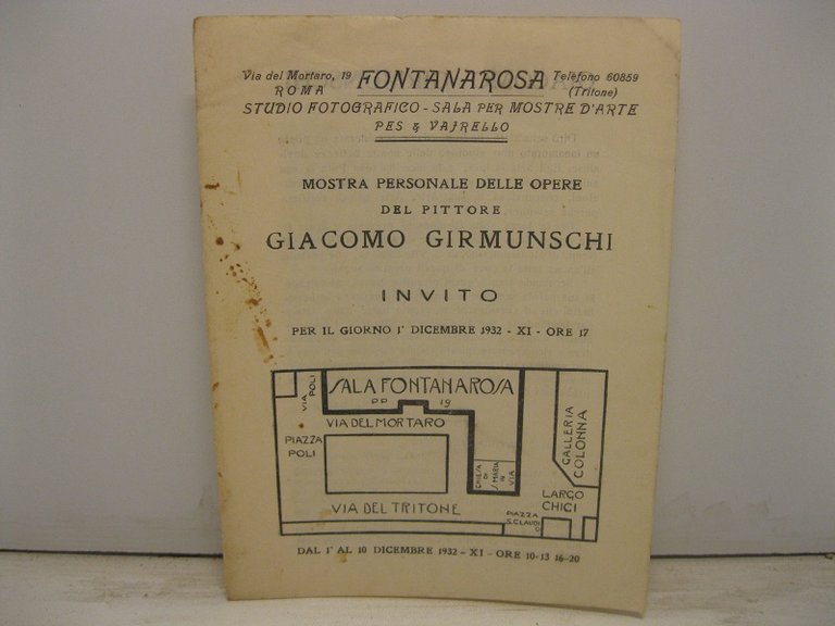 Mostra personale delle opere del pittore Giacomo Girmunschi. Invito per il giorno1 Dicembre 1932 - XI - ore 17. Dal 1 al 10 dicembre 1932 - ore 10 - 13; 16 -20. Fontanarosa. Studio fotografico - Sala per le mostre d'arte Pes& Vafrello