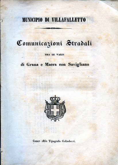 In-4°, pp. 20, editorialmente privo di legatura. Stemma sabaudo al titolo. Bell'esemplare. La relazione è stesa dal Conte Falletti di Villafalletto e dal notaio Martinengo. In fine, tabella delle distanze da Caraglio e Dronero e Savigliano passando per Busca, Villafalletto e Vottignasco, 'e seguendo le due linee attuali per Suniglia e per Levaldigi, coll'aggiunta del progetto di una terza linea da Vottignasco alla Strada Reale presso Genola'.
