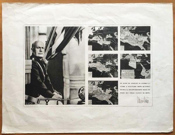 Manifesto originale 67x49. Mussolini e l'Impero "In alto le Insegne, il Ferro e i Cuori a salutare dopo quindici secoli la riapparizione dell'Impero sui Colli fatali di Roma". Foto LUCE, s.d. anni '30/40. Sono presenti nella foto le cinque insegne geografiche affisse in Via dell'Impero a Roma delle quali oggi ne restano solo quattro. Leggerissime tracce d'uso ai margini bianchi del manifesto. Raro, Buonissimo stato. , Buono (Good)