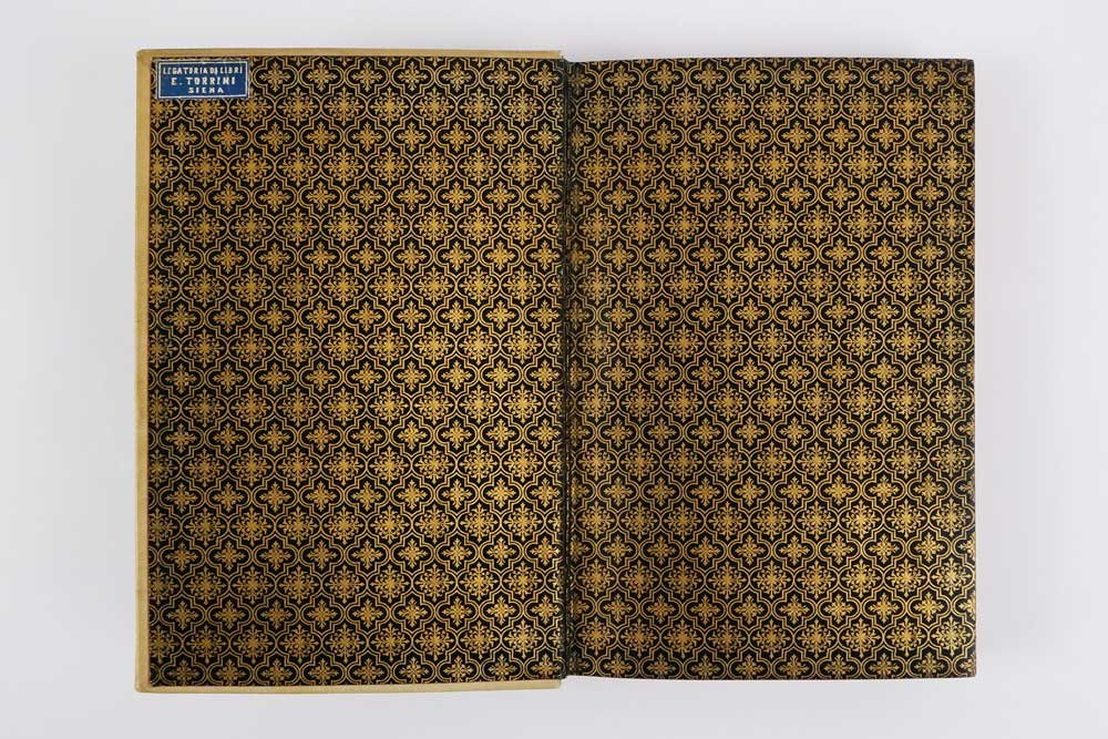 - elegante legatura coeva in piena pergamena rigida ad opera della legatoria «E. Torrini» di Siena, come attesta l’etichetta al contropiatto superiore; al dorso ricchi fregi oro e tassello con titoli, piatti inquadrati da filetto oro, al piatto superiore iniziali oro «M . C», sguardie in carta di pregio decorata oro e blu, tagli rossi; conserva i piatti della brossura originale illustrata,