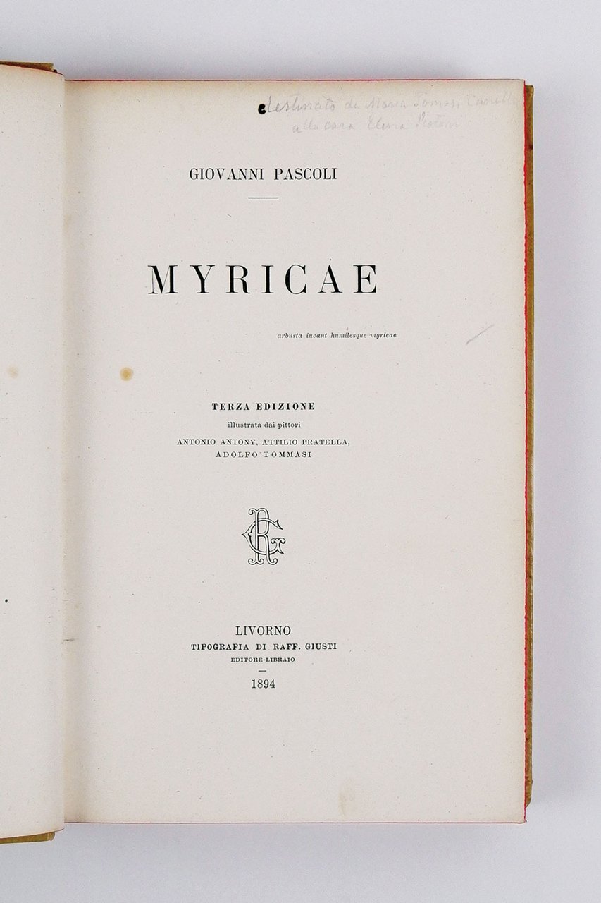 LIBROTerza edizione, notevolmente accresciuta rispetto alle precedenti e prima illustrata.Esemplare in ottime condizioni, molto fresco, in pregevole legatura professionale completa della copertina originale. Al frontespizio nota di possesso: «destinato da Maria Tomasi Canella alla cara Elena Pistoni[?]».Raccolta decisamente aumentata rispetto alle precedenti, comprende 116 componimenti, di cui ben 40 inediti, che conferiscono una fisionomia del tutto nuova all’insieme: per la prima volta, in apertura del volume e distinto dalle altre poesie, compare il poemetto «Il giorno dei morti», e «anche le sezioni crescono di numero ed escono dal generico, così da attestare una chiara volontà di ordinamento simbolico. [.] Nel complesso, il quadro dell’opera è ormai delineato e non verrà a mutare di molto nelle edizioni successive» («Myricae», ed. Nava, p. CCLIX). Nuova e definitiva è anche la prefazione, datata «Livorno, marzo del 1894». Il volume è abbellito dalle illustrazioni dei pittori Antonio Antony, Attilio Pratella e Adolfo Tommasi. La stampa di questa edizione fu sofferta e i rapporti con l’editore alquanto burrascosi: nel 1893 Pascoli annunciava agli amici che «Myricae» sarebbe stato ristampato di lì a breve, in forma accresciuta, ma l’uscita del volume tardava ad arrivare e il poeta continuava a pubblicare i propri testi su riviste e periodici. Finalmente, all’inizio del 1894, Pascoli riuscì ad accordarsi con l’editore Giusti di Livorno, ma dovette rassegnarsi a firmare un contratto decisamente svantaggioso, che gli assegnava una percentuale molto bassa sulle vendite e, soprattutto, lo obbligava a cedere all’editore tutta la proprietà letteraria delle sue «Myricae», per sempre. Nonostante le citate difficoltà contrattuali, il volume riuscì molto bene e Pascoli fu molto contento del lavoro dello stampatore, come testimonia la sorella Maria: «diceva che così bene stampato e con quelle illustrazioni gli sembravano migliori anche le sue poesie» (Maria Pascoli, «Lungo la vita», pp. 368-9).«Myricae», ed. Nava, p. CCLIX; Maria Pascoli, «Lungo la vita», pp. 368-9.