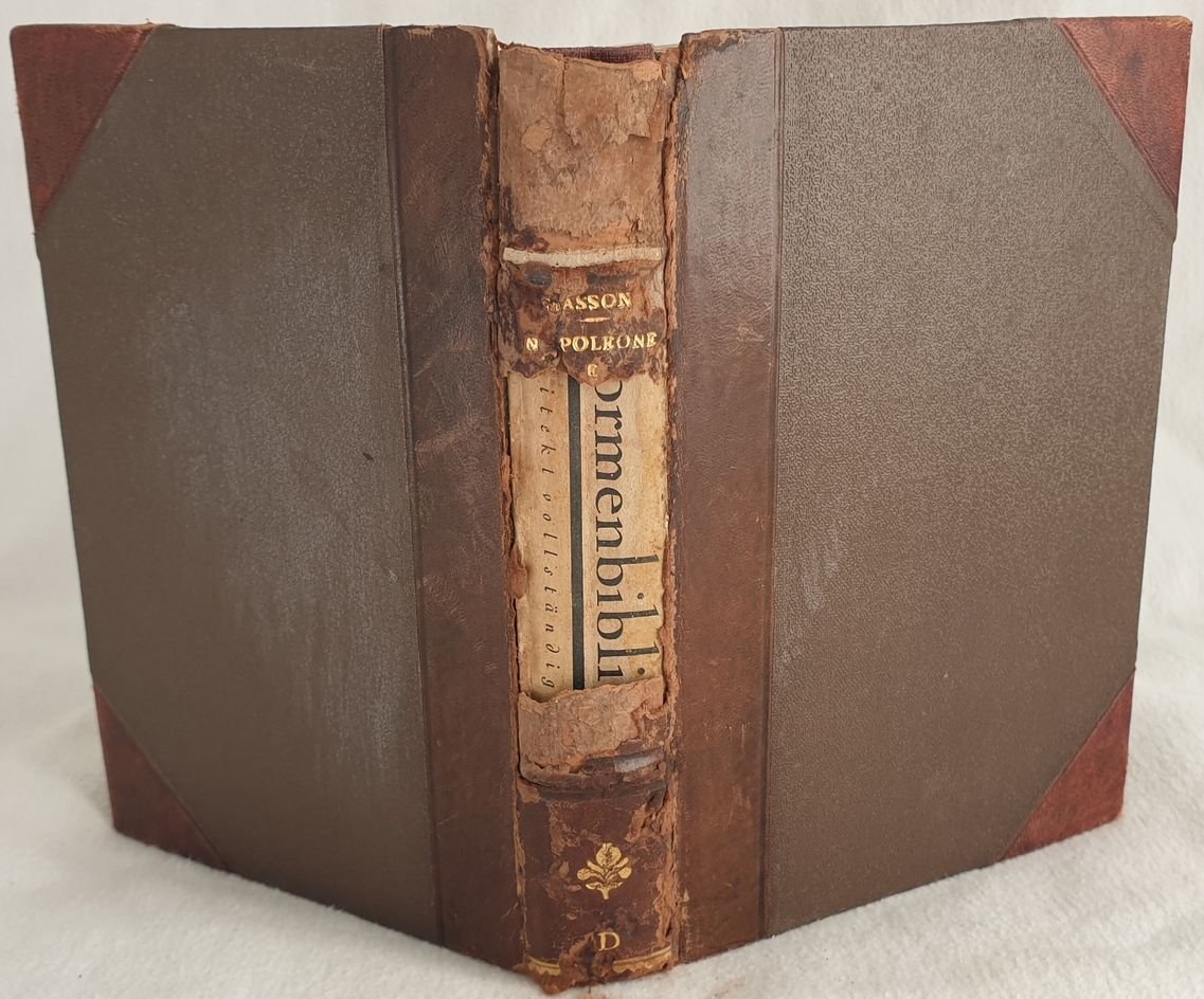 Edizione del 1934 di questa monografia su Napoleone e le donne di Federico Masson. Traduzione di M. T. Massa con prefazione di Gian Daulì. All'interno alcune planches. Tra gli argomenti trattati: Giuseppina di Beauharnais, la cittadina Bonaparte, la Grassini, Incoronazione di Giuseppina, Stefania de Beauharnais, Ortensia, Madama Walewska, Maria Luisa, Isola d'Elba, I cento giorni ecc. Ex libris al contropiatto anteriore e firma datata 1937 al frontespizio. In discrete condizioni Copertina in mezza pelle in mediocri condizioni generali con lievi usure ai margini e dorso mancante. Legatura in buone condizioni. All'interno le pagine si presentano in ottime condizioni con rare fioriture. In 16. Dim. 18,5x13,5 cm. Pp. 285+(1).Edition of 1934 of this monography about Napoleon and women by Federico Masson. Translation by M. T. Massa with prefation by Gian Daulì. All'interno alcune planches. Tra gli argomenti trattati: Giuseppina di Beauharnais, la cittadina Bonaparte, la Grassini, Incoronazione di Giuseppina, Stefania de Beauharnais, Ortensia, Madama Walewska, Maria Luisa, Isola d'Elba, I cento giorni ecc. Ex libris in the front counterplate and signature dated 1937 in the title page. In fair conditions. Half leather cover in poor general conditions lightly worn in the extremities and spine lacking. Binding in good conditions. Inside pages are in very good conditions with occasional foxings. In 16. Dim. 18,5x13,5 cm. Pp. 285+(1).