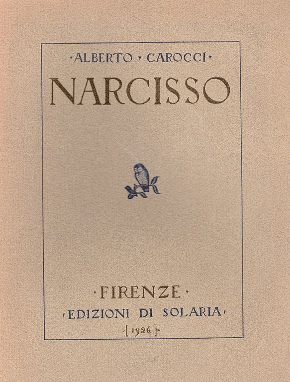 In-8°, pp. 90 (4), cartoncino floscio editoriale con titoli a due colori al piatto anteriore con vignetta incisa (nottola) ripetuta più volte nel testo (Bruno Bramanti). Testo stampato entro cornice tipografica verde. Edizioni di Solaria, quaderno primo. Ottimo esemplare a fogli chiusi (n° 162/185) entro velina. Prima non comune edizione del testo inaugurale della collana di Solaria nonché opera prima di Alberto Carocci (1904-1972) fondatore di Solaria e padre del futuro editore Giovanni (1932-2018).