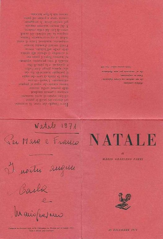 Cartoncino rosso ripiegato In-16°, quattro facciate stampate con titolo, Distico, Poesia e dati tipografici. Edizione in 200 esemplari, all'ultima facciata, dedica autografa firmata dal poeta. -(Mario Graziano Parri celebre saggista, scrittore e poeta di origine bolognese, ma da sempre legato a Firenze).