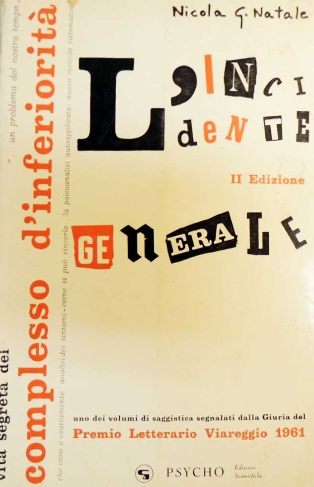 Nicola G. Natale, Vita segreta del complesso d’inferiorità, Psycho Edizioni Scientifiche, Bologna 1961, seconda ed. intitolata L’incidente generale, pp. 251, cm 24, br. ed. Collana di Studi Neofreudiani, n. 1. Tracce d’uso alla brossura, con una piccola mancanza al dorso, pagine leggermente ingiallite.