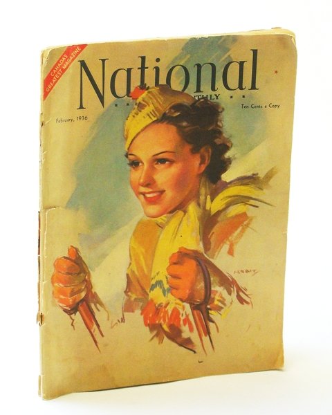 64 pages. Features: Cover illustration of female skier by Jules Erbit; Ad for the Dodge "D2" (four-door) Touring Sedan inside front cover; Editorial discusses King Edward VIII succeeding King George V; Lucky Cumsie Jones (fiction); Everything Went Well Until (fiction); Japan's Amazing "War" on World Trade - fascinating photo-illustrated article discusses Japan's quick development as an exporting nation; The Spongers (fiction); The Fire Brand (fiction); The Kiss (fiction); The Sudbury Basin - Where Nickel is King - photo-illustrated article; Photo-illustrated article on the bobsleigh (bobsled) run at Lucerne-in-Quebec; Nice one-page Plymouth car photo ad; Nice one-page ad for Mutual Life of Canada features photos of sixteen children from across Canada including William Cruikshank of Lacombe, Alberta, Jaques Tremblay of Loretteville, Quebec, and Roma and Jack Porter of Sudbury; Classy colour GM centrefold ad features the "New Chevrolet"; Lysol half-page ad includes photo of the Dionne Quints; Hollywood News; Illustrated ad for Jaffa oranges and grapefruit from Palestine; Classy colour-illustrated ad for the new Ford V-8 for 1936 inside back cover; and more. Above-average external wear, primarily to coverfold. Covers detached by present. Unmarked. A worthy copy of this wonderful vintage issue. Book