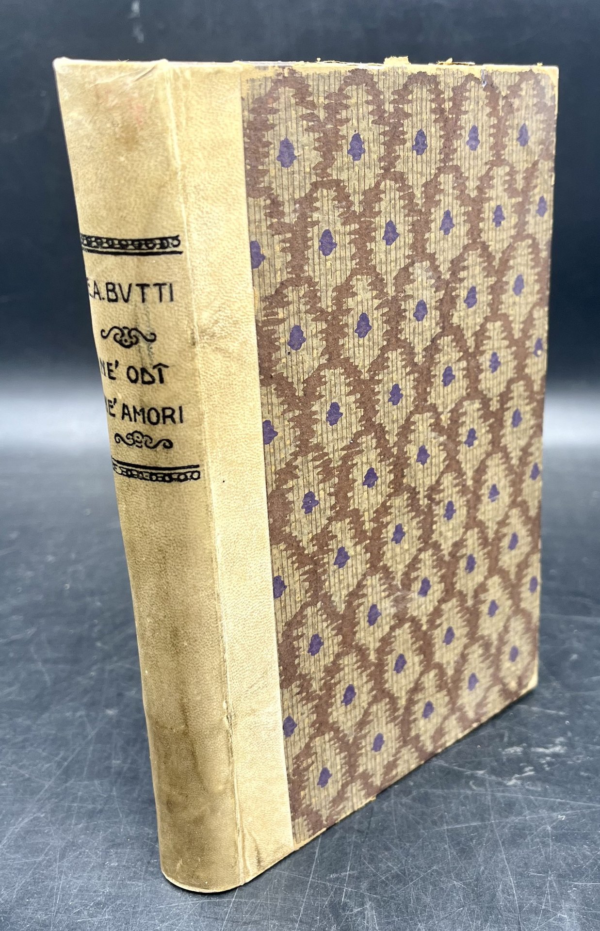 In-16° (cm. 18,7), pp. XI, 277. Bel volumetto in speciale sobria legatura coeva d'amatore in mezza pergamena e angoletti, elegante titoloe fregetti a china al dorso, insolita carta decorata ai piatti, tagli rossi, nastrino segnalibro. Contiene testi di critica letteraria su: nuovo teatro romantico (Sudermann, Ibsen.), il pubblico e il teatro (Mascagni, Marco Praga, ecc.), sul romanzo (D'Annunzio innovatore, Rovetta conservatore), letteratura FEMMINILE (Serao, Contessa Lara, Neera e il suo "Senio", il romanzo maschile nelle mani d'una donna.), morale e romanzo (Spencer, 'Daniele Cortis' immorale?, Edouard Rod e Gaetano Negri e "La perseveranza", Rosny). CARDUCCI barbaro, le POETESSE Elda Gianelli, Annie Vivanti, Ada Negri. BUTTI, avverso al positivismo,