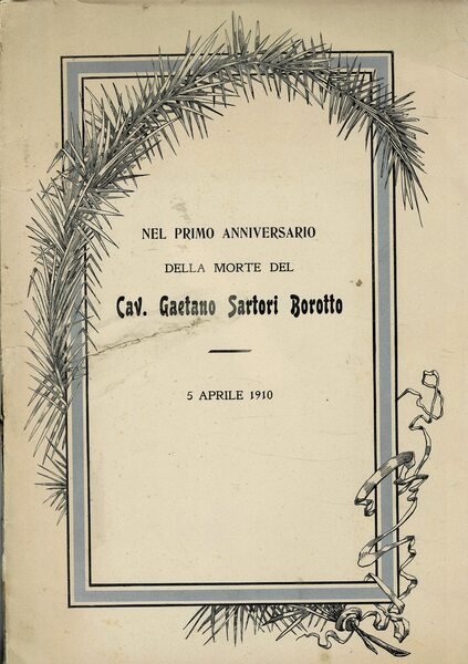 Nel primo anniversario della morte del cav. Gaetano Sartori Borotto. 5 aprile 1910. Epigrafi, annunci, giornali, celebrazioni sulla bara, telegrammi, lettere, biglietti, firme, torcie.
