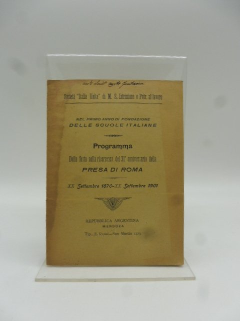 In 16 (cm 13 x 18), pp. 19 + (1). Gora al margine interno del piatto anteriore e del frontespizio. Dedica del Direttore Didattico della Societa' Italia Unita di Istruzione e Patronato al Lavoro a pagina 2. Timbro della Societa' al frontespizio. Nel 1901 sorse a Mendoza la Societa' Italia Unita di Istruzione e Patronato al Lavoro nata dalla fusione della Societa' Nazionale Italiana e della Societa' operaia italiana. La Societa' si prefiggeva di "migliorare le condizioni morali, civili e economiche dei soci che ne fanno parte mediante la educazione, la istruzione, la protezione al lavoro ed il mutuo soccorso in caso malattia". Questa pubblicazione comprende poesie declamate da alunni e una breve commediola nell'ambito della festa che si svolse per il trentunesimo anniversario della Presa di Roma.