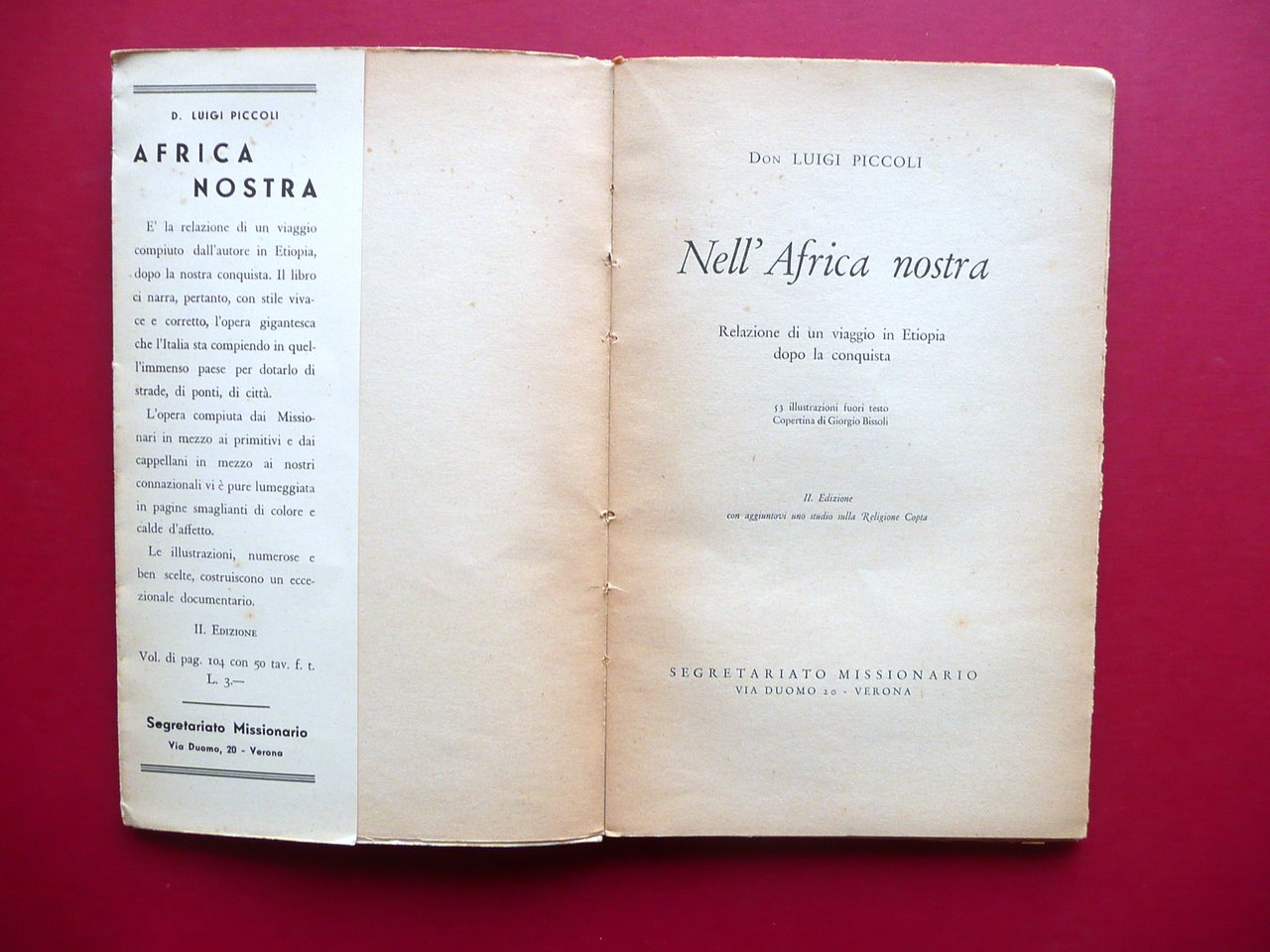 Don Luigi Piccoli, Africa Nostra relazione di un viaggio in Etiopia dopo la conquista 53 illustrazioni fuori testo copertina di Giorgio Bissoli II° edizione, con aggiuntovi uno studio sulla religione copta Segretariato Missionario, Verona 1938; cm 23x14,5; pp. 98 più 53 ill. fotogr. in b/n fuori t.; brossura ed. ill. a colori conc bandelle; grafica di copertina di Giorgio Bissoli. Condizioni di conservazione Esemplare in buono stato con tracce d'uso, piccole leggere bruniture, margini delle brossure e cuffie con alcune minuscole abrasioni. Margini delle pagine con lievi accenni di ingiallimento a causa del tipo di carta; margine esterno delle pp. 15-16 con un piccolo taglietto. SETT190.L17448 N