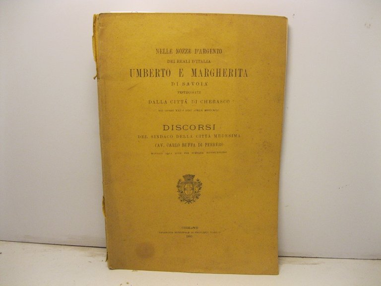 Nelle nozze d'argento dei Reali d'Italia Umberto e Margherita di Savoia festeggiate dalla citta' di Cherasco nei giorni XXII e XXIII aprile MDCCCXCIII. Discorsi del sindaco della citta' medesima cav. Carlo Buffa di Perrero mandati alla luce per pubblica sottoscrizione