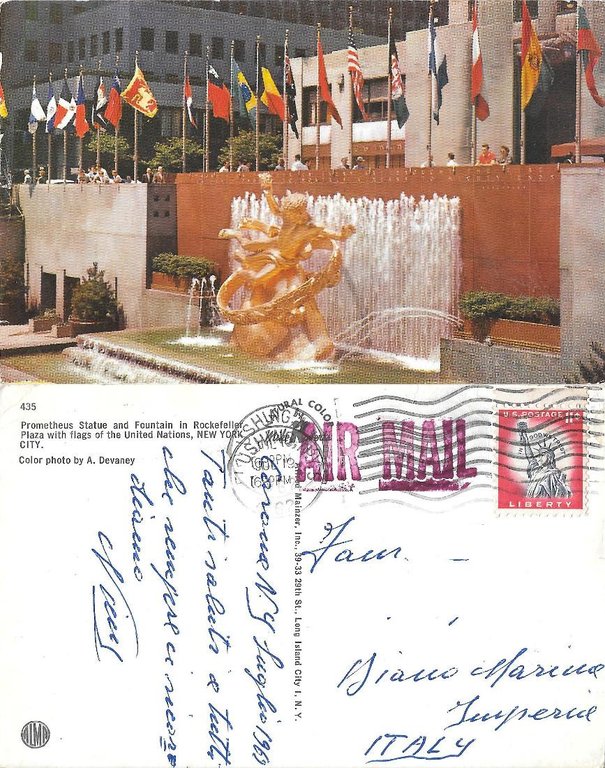 New York. Prometheus Statue and Fountain in Rockfeller Plaza. Viaggiata 1962