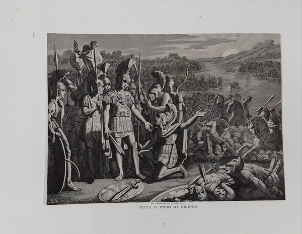Nicia ai piedi di Gilippo. Incisione in rame all'acquaforte. DE VIVO, 1833.