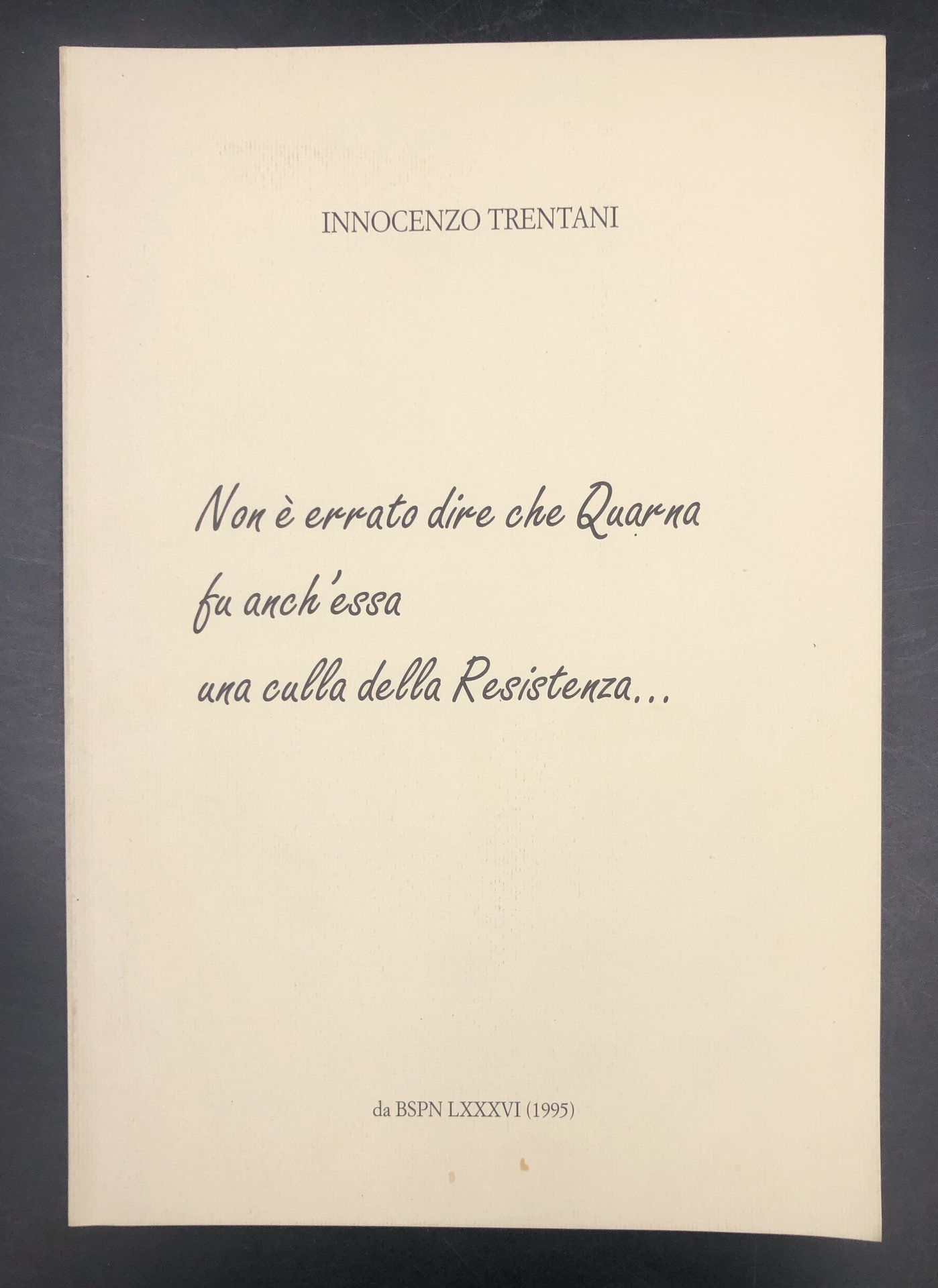 In-8° (cm. 24x16,6), pp. 144 con 26 FOTO (vedute, vedute con nomi di località, foto di partigiani, documenti ecc. Cartoncino edit. L'Autore pubblicò poi nel 1996 "Noi delle Quarne". Questa memoria sulla Resistenza invece è datata in fine "Quarna Sotto, anno 1968. Come nuovo.