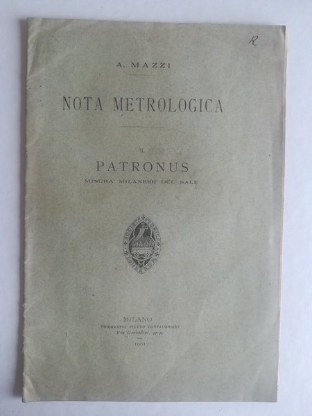 In 8 (cm 16 x 24), pp. 19 + (1b). Qualche fioritura alle pagine. Brossura editoriale. Estratto editoriale dall'Archivio storico lombardo. Saggio relativo a questa unita' di misura in vigore a Milano nell'XI secolo e fino al Trecento, il patronus, unita' di misura del sale (sextaria salis).