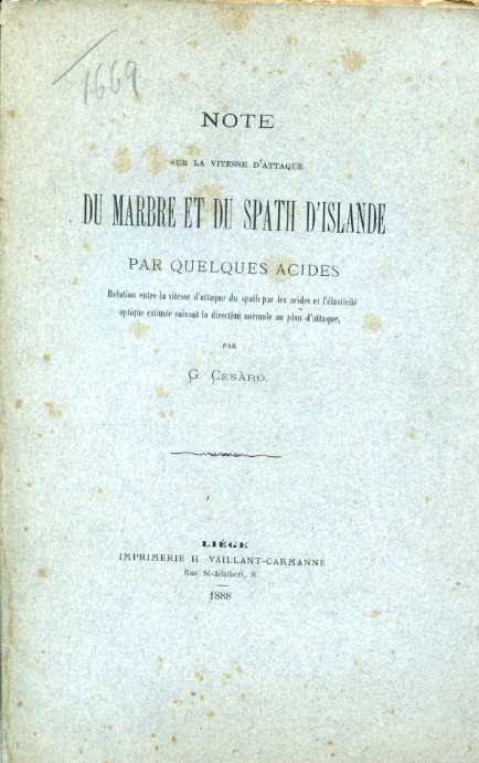 Note sur la vitesse d'attaque du marbre et du spath d'Islande par quelques acides. Relation entre la vitesse d'attaque du spath par les acides et l'elasticité optique estimée suivant la direction normale au plan d'attaque