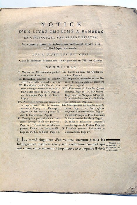 Notice d’un Livre imprimé à Bamberg en 1462, lue à l’Institut National.