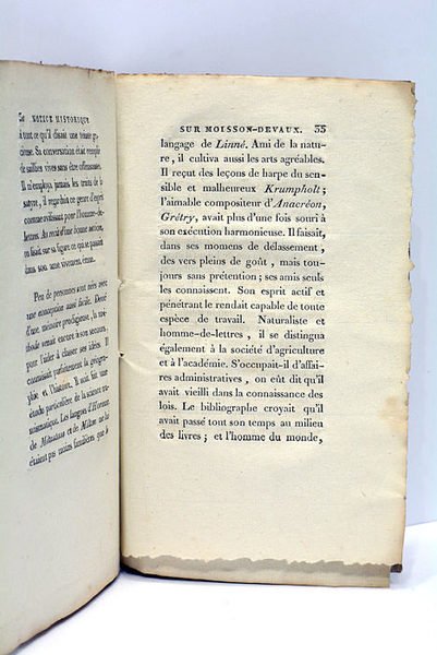 35 pages. (17,5 x 11 Cm). Cartonnage souple de l'époque. Salissures sur les plats. Quelques taches à l'intérieur. Très rare notice biographique sur le botaniste normand Gabriel Pierre François Moisson Devaux (1742-1802), qui se fit notamment connaître par les magnifiques jardins qu'il avait plantés à Bayeux, et dans lesquels il réussit l'acclimatation de plusieurs plantes exotiques comme le magnolia et le sassafras.