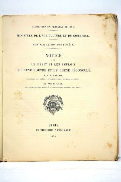 Notice sur le débit et le emplois du chène rouvre et du chène pédonculé. Exposition universelle de 1878. Ministère de l'agriculture et du commerce. Adminstration des forêts.