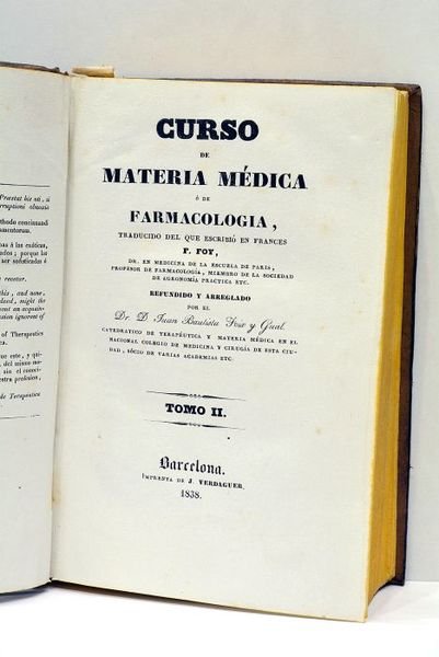 Noticia de las aguas minerales mas principales de España. Apéndice al curso de materia médica o farmacologia. Barcelona, J. Verdaguer, 1840. RELIE AVEC (à la suite): 2). FOY. Curso de Materia Médica ó de Farmacologia. Refundido y arreglado por el Dr. D. Juan Bautista Foix y Gual, catedratico de terapéutica y materia médica en el nacional colegio de Medicina y Cirugía de esta ciudad, sócio de varias academias, etc. Barcelona, J. Verdaguer, 1838.