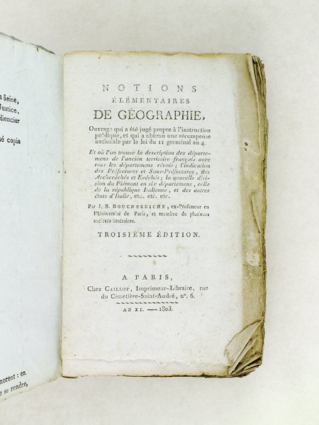 Ouvrage qui a été jugé propre à l'instruction publique, et qui a obtenu une récompense nationale par la loi du 11 germinal an 4, Troisième édition, 1 vol. in-12 br. sous couv. d'époque, Chez Caillot, paris, An XI, 1803, VIII-375 pp. Bon état