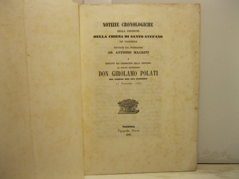 Notizie cronologiche della erezione della chiesa di Santo Stefano in Vicenza. dedicate dai fabbricieri dela medesima al molto Reverendo Don Girolamo Polati nel giorno del suo ingresso 27 ottobre 1857.