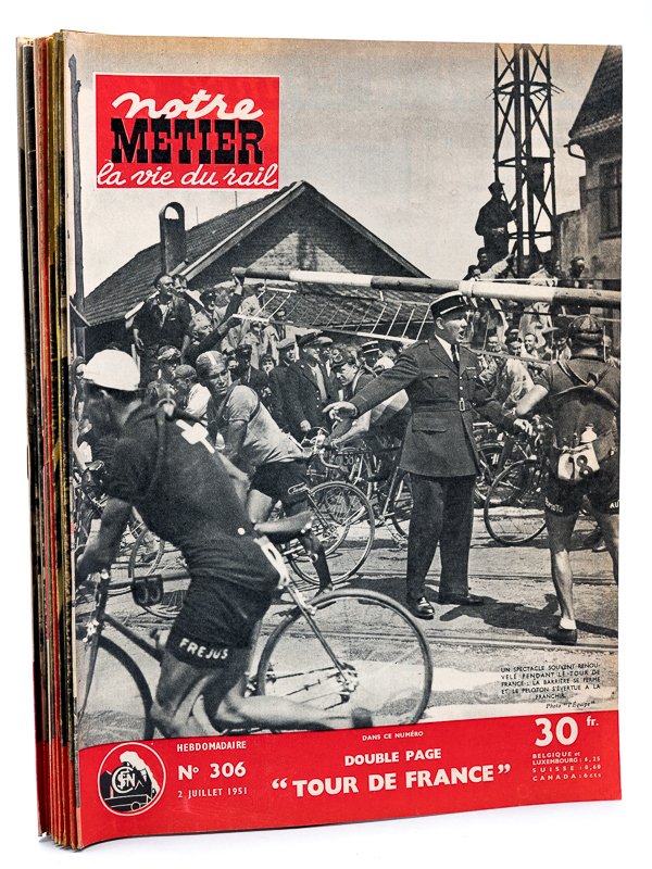 24 vol. petits in-folio br., couv. ill. noir et blanc ou couleurs, ill. noir et blanc, Notre Métier, 11 rue de Milan, Paris, 1951, 15 à 24 pp. par numéro. Format de 36 x 27 cm. Bon état (rouss. en bords sur deux couv., très bon état par ailleurs). Année peu courante dans une telle série et en aussi bon état. Prix pour l'ensemble. La revue "Notre Métier", fondée dans les années 30, changea progressivement de nom entre 1950 et 1952, pour devenir la célèbre revue "La Vie du Rail". Au sommaire des numéros proposés ici, notamment : "Tour de France" ; Poitiers et ses environs ; Le poste de Bry-sur-marne ; Pour le Brésil, locomotives françaises ; Le Havre ; Le chemin de fer de Montenvers ; Le ferry-boat St-Germain ; Traction électrique (n° 313 52 pages) ; de Lulea à Narvik ; Le succès des Autorails au Pays de Gex ; Service d'Hiver ; Département 16 "Autorails" ; Un poste moderne d'aiguillage à Juvisy ; Le problème de l'emballage et la SNCF ; Le dépot de Batignolles ; à Annecy, un Congrès sur la traction à courant monophasé ; La chaîne du froid ; Cheminots inventeurs ; Le nouveau matériel du métro ; Grande première sur le Nord ; Inauguration du nouvel atelier des C. F. L. à Luxembourg ; Le dépôt de Paris-Ivry ; Noël 1951 ; à Madagascar, itinéraire touristique rail-route.