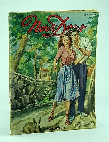 22 pages. Text in French. Gorgeous romantic color cover art. Illustrated romantic tales. Image of Elizabeth Taylor in Forvil ad. Colour Arthur et Zoe (Nancy and Sluggo) cartoon on back cover. Average wear. Unmarked. A charming vintage copy. Magazine