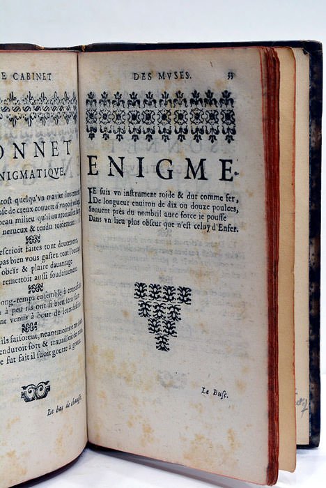 10 feuillets. 121 pages. (i.e. 221). 1 feuillet. 60 pages. (15x9 Cm). Demi veau. Dos lisse orné (Reliure du XIXe s.). Tranches rouges. Coins et coiffes émoussés. Charnières frottées. Recueil de poésies amoureuses édité par Bertrand de La Mathe. Paru pour la première fois en 1658 il fut réédité en 1660´et augmenté d'un supplément en 60 pages. Taches et rousseurs éparses. Ornements et culs-de-lampe.