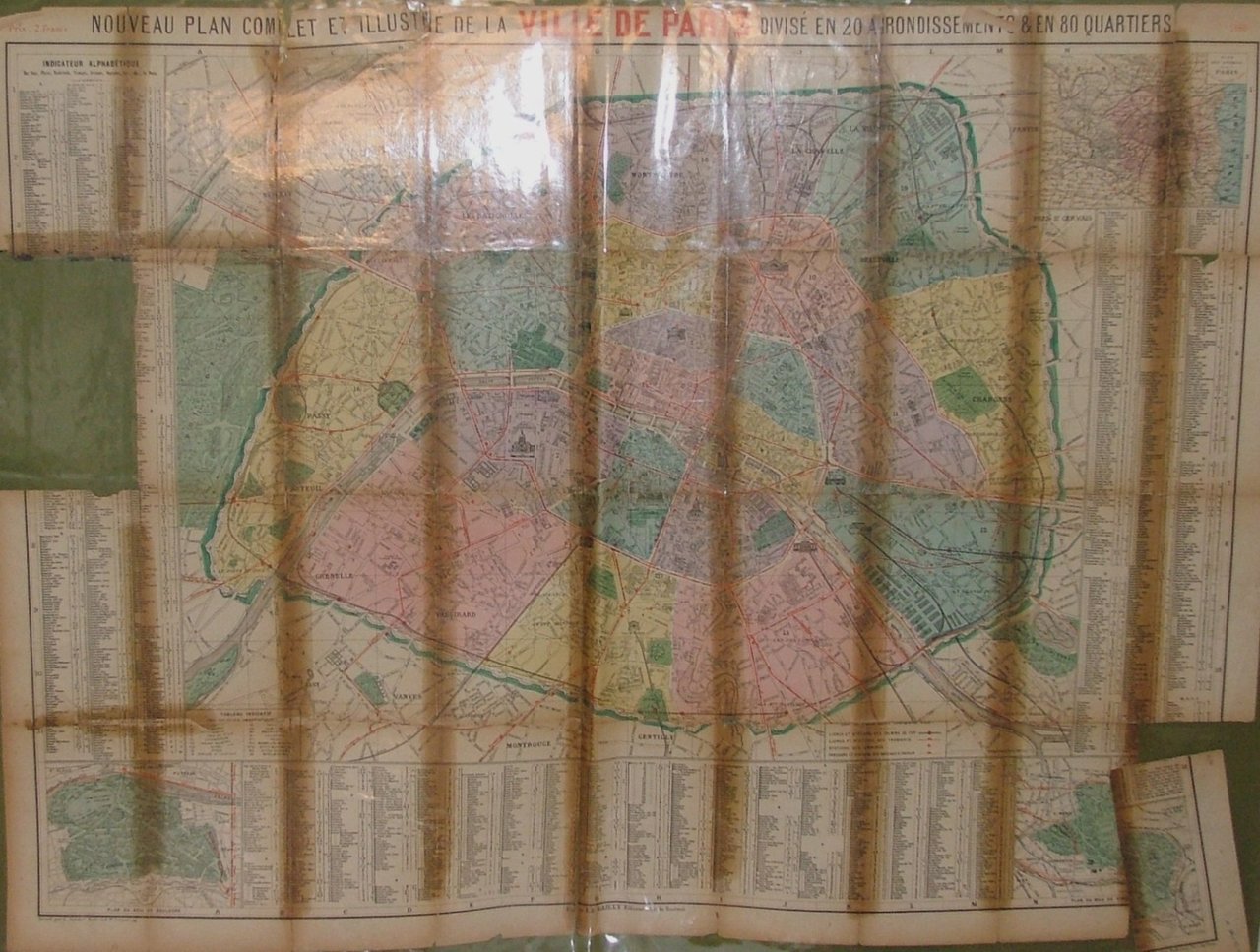 Carta di Parigi, a colori, di cm. 66 x90. La carta è priva dello stemma della città. Mende alle piegature.