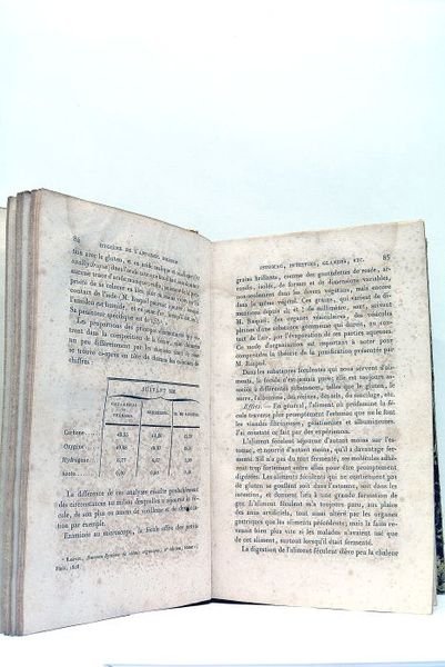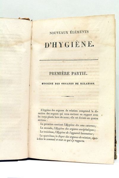 2 volumes: 1). XVI + 420 pages 2). 4 pages + 608 pages (13x21cm). Reliure Ancienne Demi Cuir. Coins émoussés. Plats, dos et mors frottés. Mouillures. Rousseurs. Quelques feuillets se détachent partiellement. Papier fortement noirci par endroits. "Effets de la Vanité, de l'Ambition, de l'Amour de la Gloire, dans un degré modéré". "Examen de quelques exercices actifs : marche, danse, natation, escrime, etc."Effets du Sommeil". "Composition des Lits: soins qu'ils réclament". "Des Soins qu'exigent les productions épidermoiques, et des divers cosmétiques: Cheveux, Barbe, Ongles. Fards". "Effets des Bains". "Effets des Boissons". "Hygiène des Organes de Nutrition". Etc.
