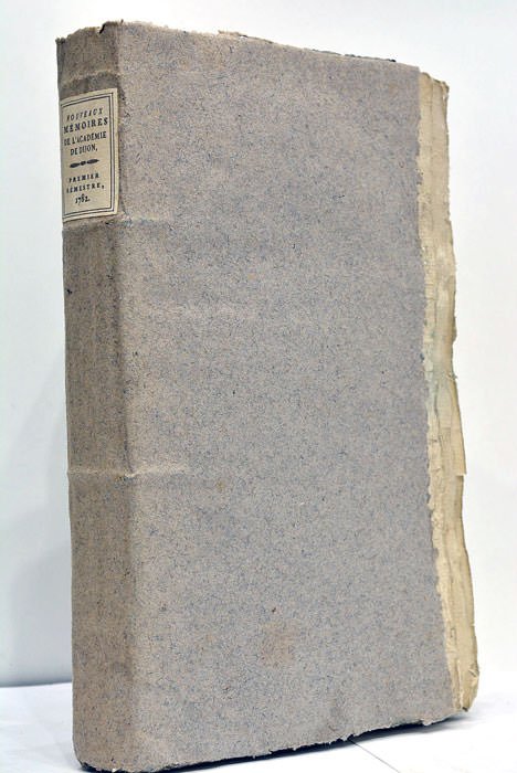 (1 feuillet blanc). 3 feuillets. 255 pages. 1 planche gravée hors-texte dépliante. (21x14 Cm). Broché, couverture muette de l'époque. Étiquette de titre collée au dos. Première parution sous le titre de "Nouveaux Mémoires", des travaux de l'Académie de Dijon dont le chimiste Guyton de Morveau fut l'un des membres les plus actifs. Le présent volume contient 4 textes signés de lui: "Recherches pour perfectionner la préparation des couleurs employées dans la Peinture", "Observations sur la congélation de l'acide variolique concentré", "Examen des mines de cuivre, appelées verd de montagne, bleu de montagne, et de ce qui constitue leur différence", et "Observations minéralogiques et chimiques, sur le spat pesant et sur la manière d'en retirer le barote ou terre barotique". On y trouve par ailleurs un important mémoire de Maret intitulé: "Mémoire sur la construction d'un Hôpital, dans lequel on détermine quel est le meilleur moyen à employer pour entretenir dans les Infirmeries un air pur et salubre". Il est illustré d'une planche gravée dépliante reliée à la fin de l'ouvrage. Bel exemplaire très pur, non rogné et non coupé.